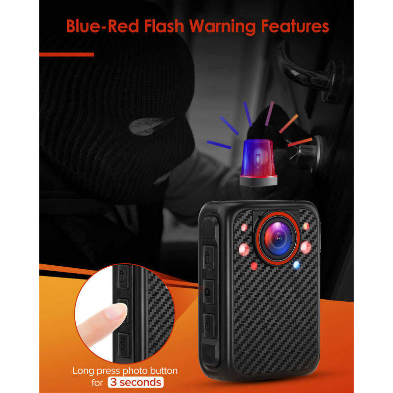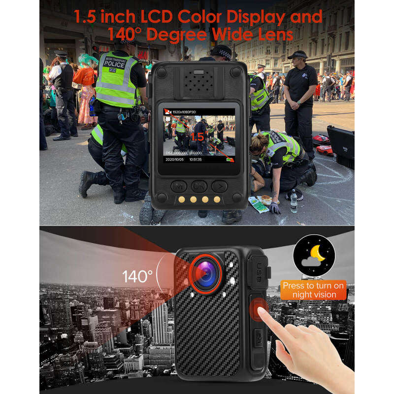 【Full HD 1080P human body camera: 】 A human body camera with full HD 1080P video resolution, with manual night vision function, it has built-in 1 white LED light, one red and one blue patrol light, which can capture the face clearly in low light conditions The picture, 140° wide angle allows users to capture more information about key nearby scenes. Very suitable for police patrols, meeting records, driving records.