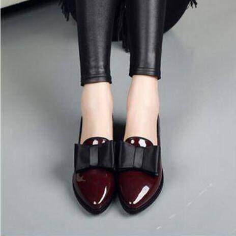 Ladies British Style Flat Pointed Patent Leather Bow Low Heel Small Leather Shoes