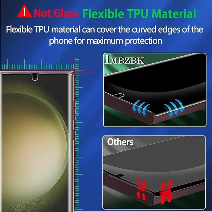 [Flexible Material & Bubble-Free] Please note: The screen protector is not tempered glass. It is made from premium thermoplastic polyurethane (TPU), a flexible material that conforms to the curved edges of the Samsung S23 Ultra, providing maximum scratch protection. Features nano-elasticity to prevent screen damage from drops. Utilizes highly permeable adhesive for strong bonding; minor scratches and bubbles may self-heal within 24 hours.
